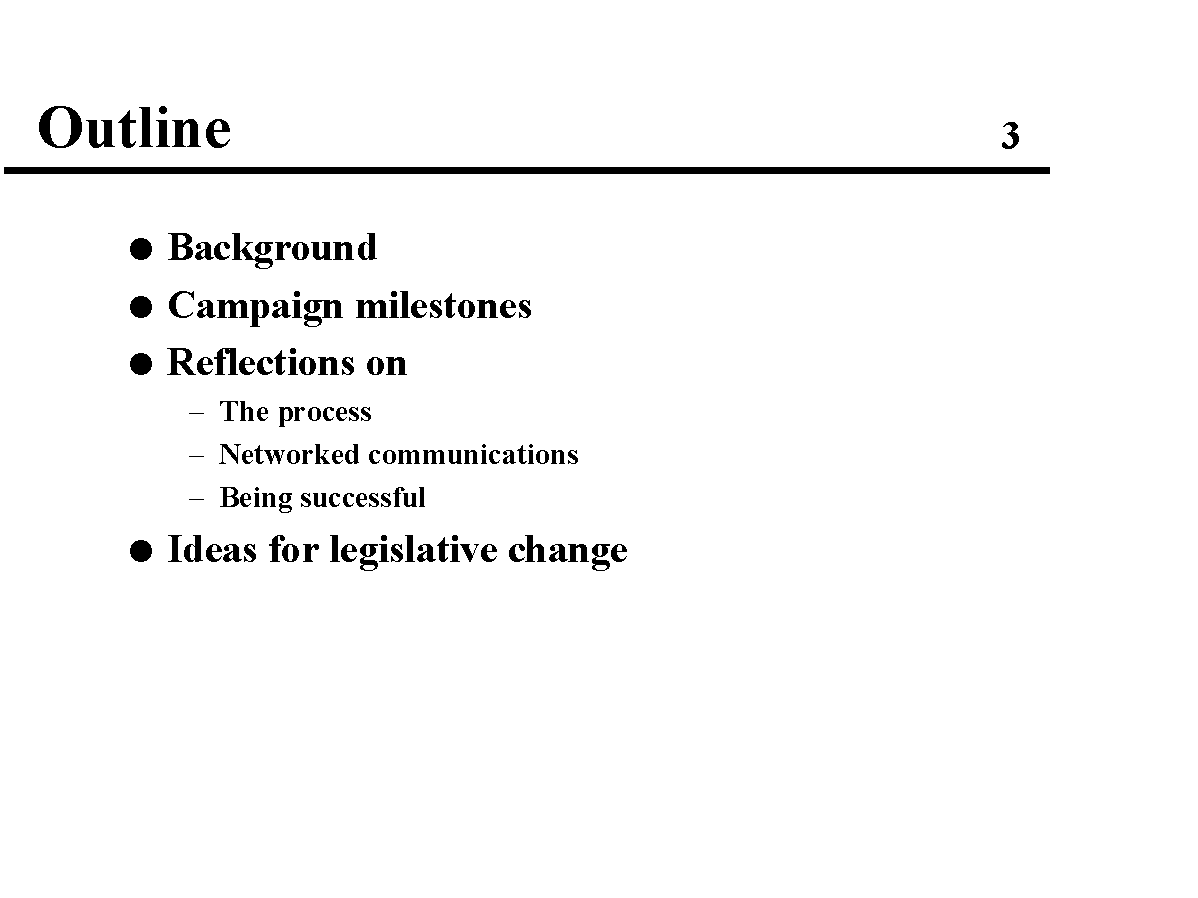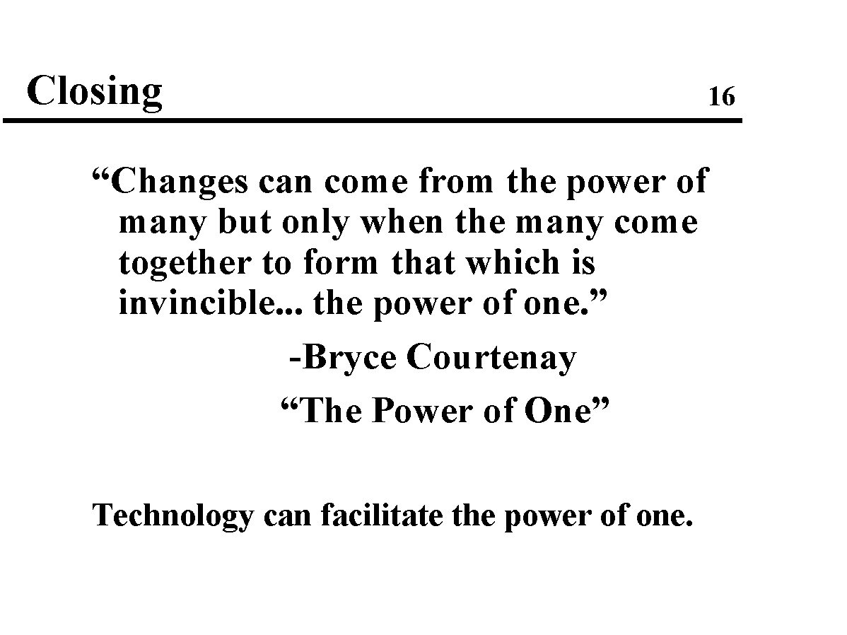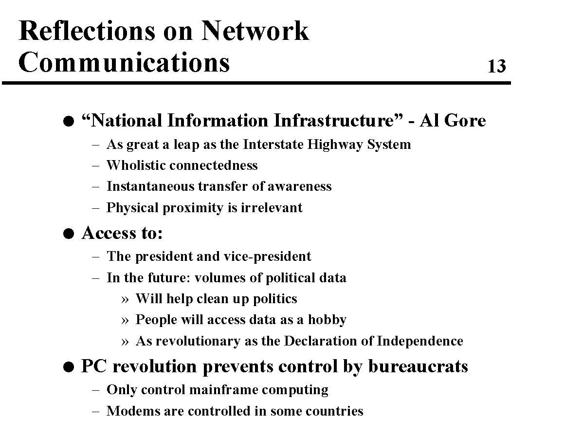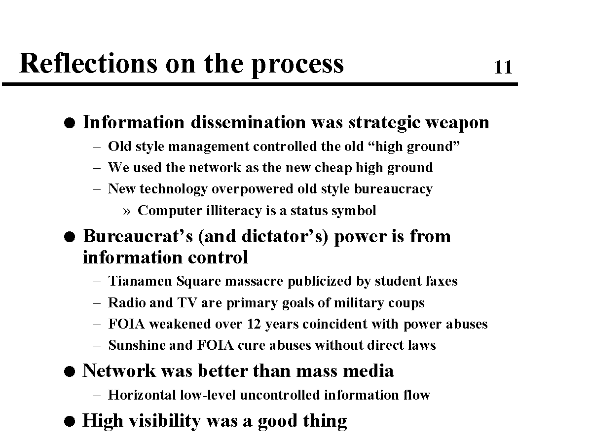 This is a talk I wrote about my experience and what I learned about our campaign using the electronic medium to help level the playing field. I presented the talk (at an evening session) at the 1993 World Future Society Conference in Washington, DC, during the summer of 1993.