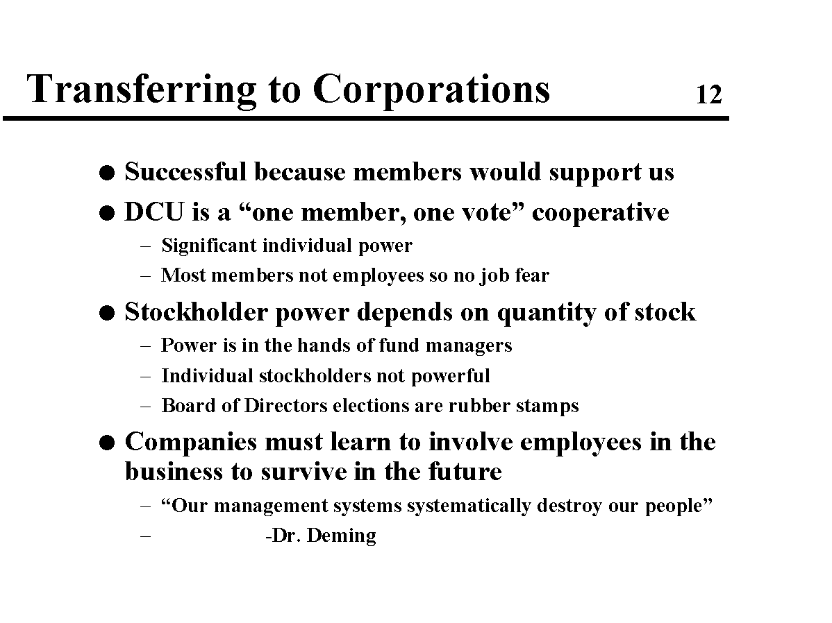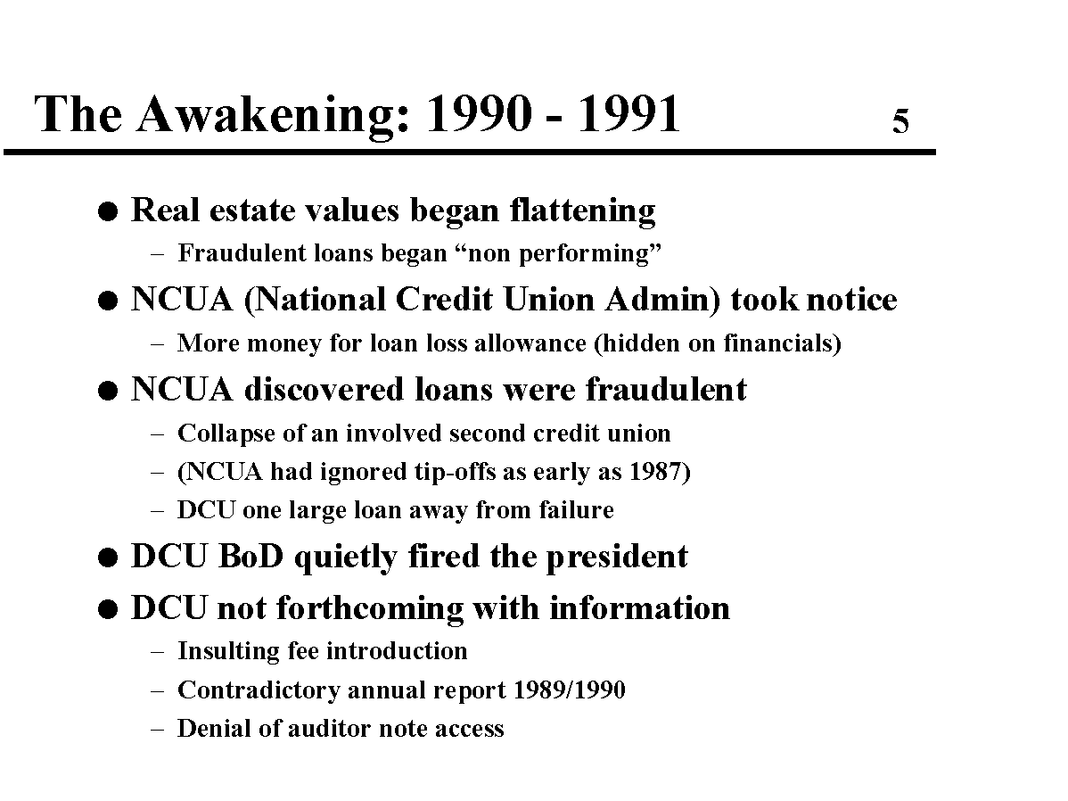 I was among a group of Digital Employees concerned about the future of our credit union. Previous to the DCU problems, we had not known each other. We became acquainted through the use of the DCU Notes File (an electronic bulletin board) available on the internal company network (before the internet became big). We decided to meet in person and later mounted a campaign to return our Credit Union back to what credit unions are supposed to be.