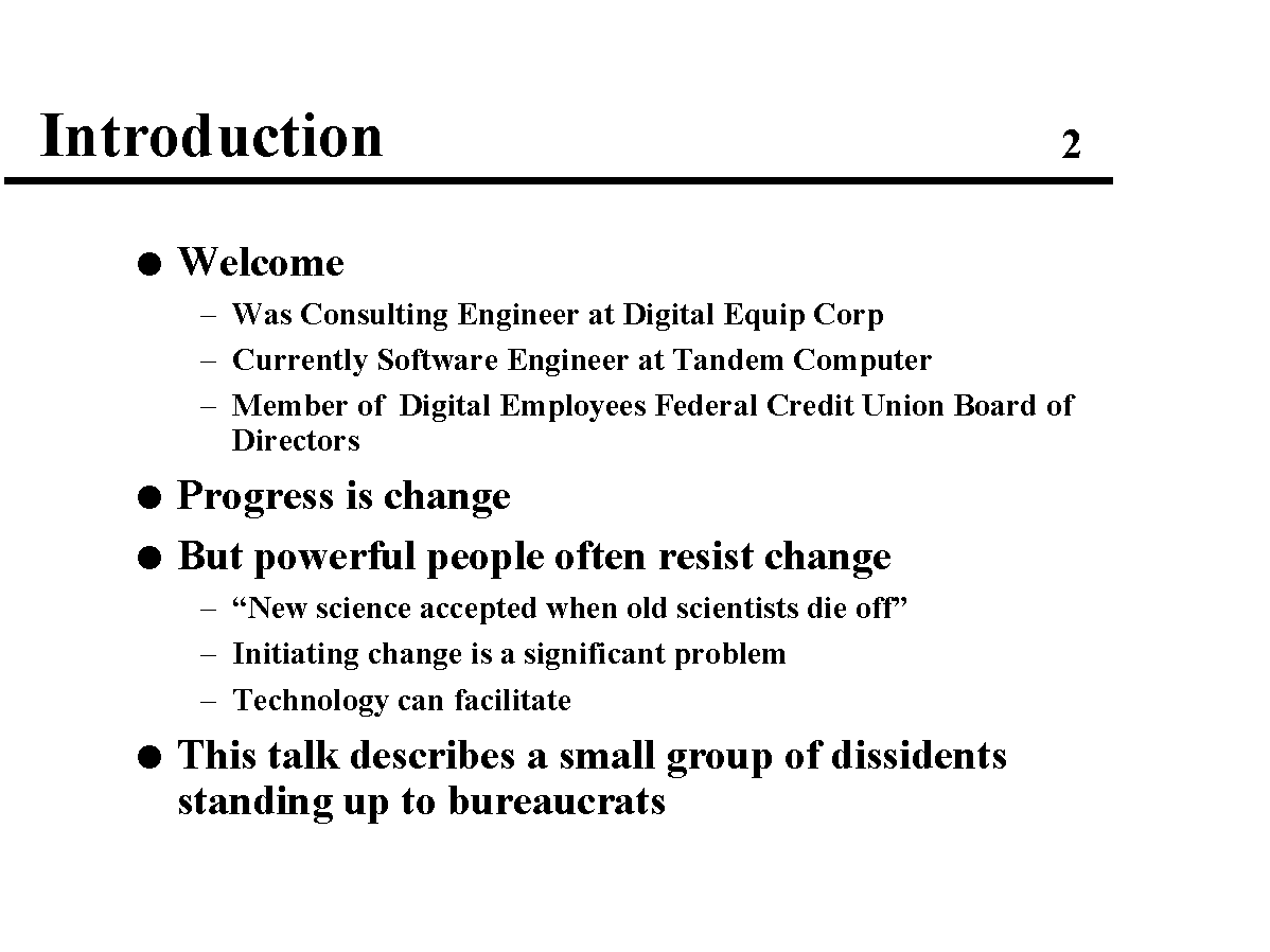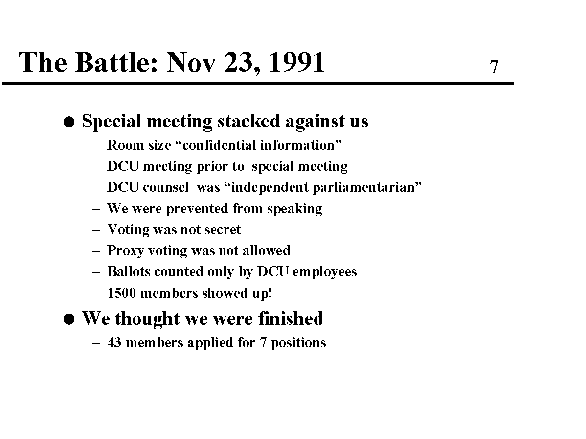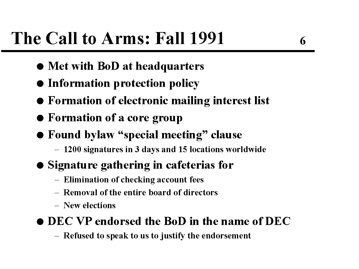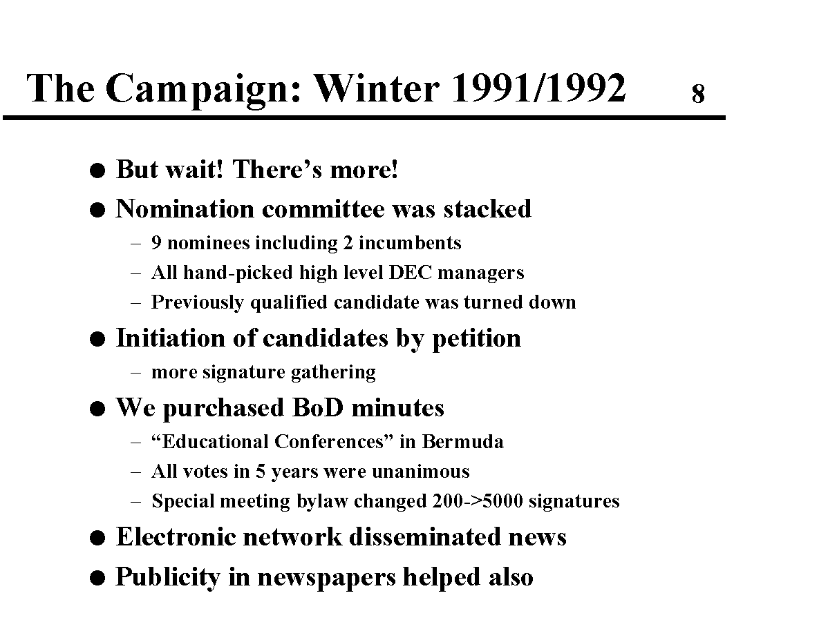 The campaign became very intense with significant pressure on our DEC jobs to give up our efforts, but we persevered. I was sad and disgusted at how dirty the politics became - all that for a volunteer position (board membership). In spite of valiant efforts on the part of the DEC management, we did recover our credit union and I'm proud to have been a part of that effort. I believe our effort was one of the first cases of the electronic network being used to combat the power of the incumbency and the power of the high-level management of DEC.