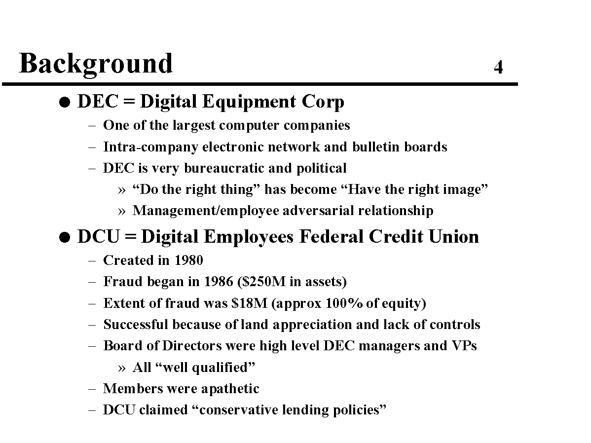 In 1991, the DCU Credit Union was rocked with a major fraud perpetrated primarily by the DCU president. The fraud was able to occur in part due to poor oversight by the Board of Directors - all of whom were high-level DEC (Digital Equipment Corp) managers.